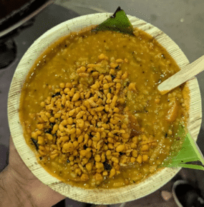 In darshinis, Bisi Bele Bath is usually prepared in large steel vessels that stay simmering for hours. Served quickly on steel plates or trays, it is eaten standing at counters or seated briefly before heading back into the rush of the day. Despite the speed, the dish never feels rushed.